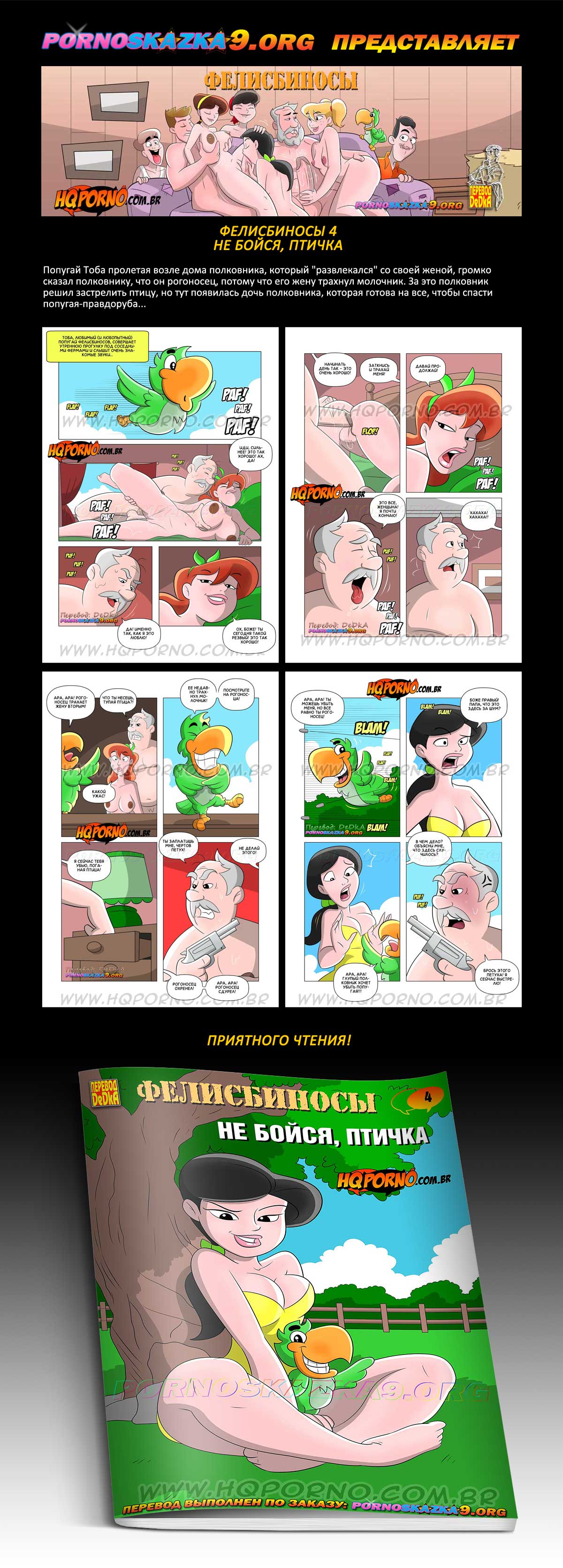 Порно комикс Фелисбиносы. Часть 4. Не бойся, птичка. Попугай Тоба пролетая возле дома полковника, который «развлекался» со своей женой, громко сказал полковнику, что он рогоносец, потому что его жену трахнул молочник. За это полковник решил застрелить птицу, но тут появилась дочь полковника, которая готова на все, чтобы спасти попугая-правдоруба…