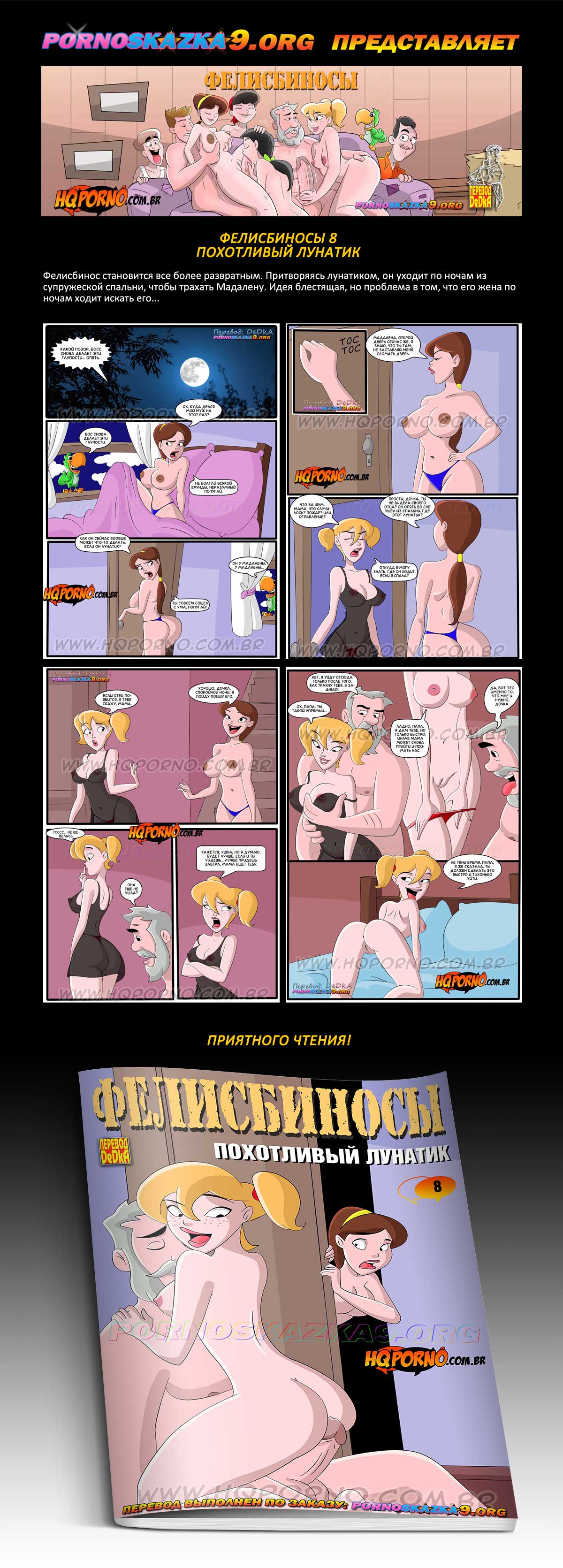 Порно комикс «Фелисбиносы. Часть 8. Похотливый лунатик.» Фелисбинос становится все более развратным. Притворяясь лунатиком, он уходит по ночам из супружеской спальни, чтобы трахать Мадалену. Идея блестящая, но проблема в том, что его жена по ночам ходит искать его…